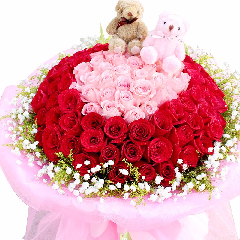 花 材:99支精品混色玫瑰(红玫瑰、粉玫瑰)+2只可爱小熊,搭配适量白色满天星、黄莺。