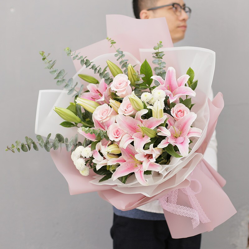 花 材:6朵粉玫瑰,6支粉色多头香水百合,搭配白色小雏菊(或洋桔梗)、尤加利叶、栀子叶装饰。