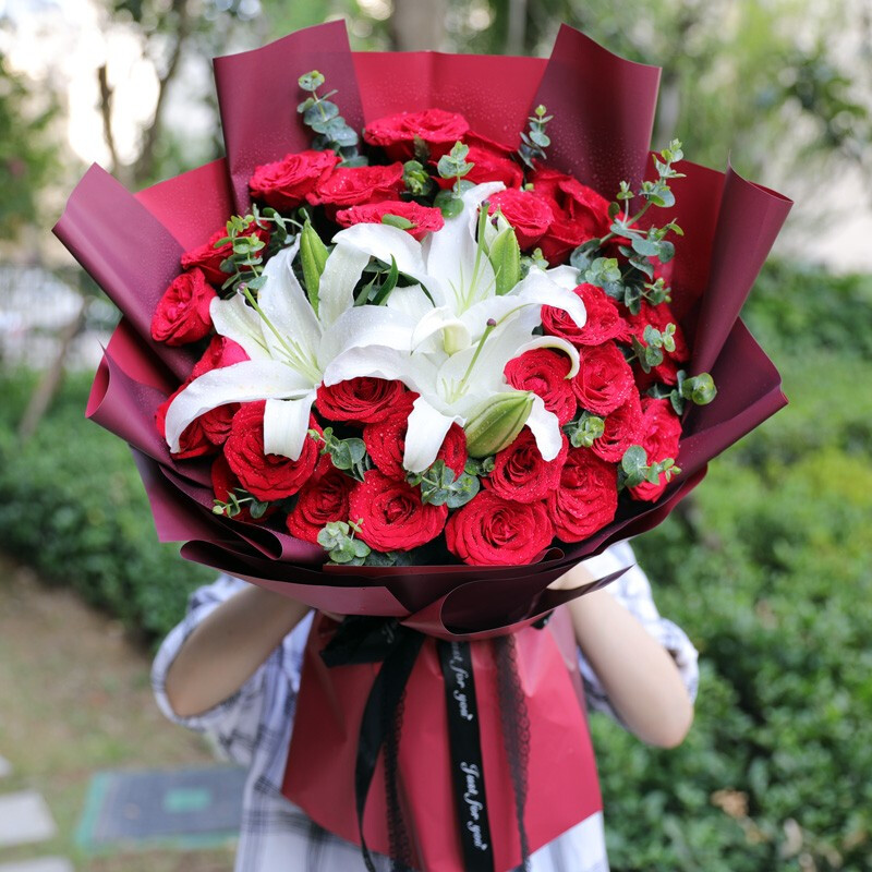 花材: 33朵精品红玫瑰,2支多头白色香水百合,搭配尤加利叶装饰。