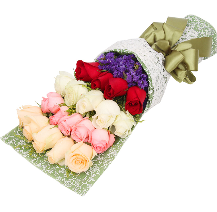 花 材:精选19朵玫瑰(5朵香槟玫瑰、5朵粉玫瑰、5朵白玫瑰、4朵红玫瑰),黄莺、勿忘我点缀。