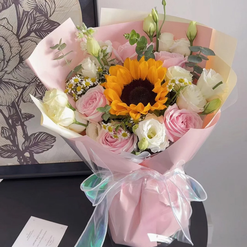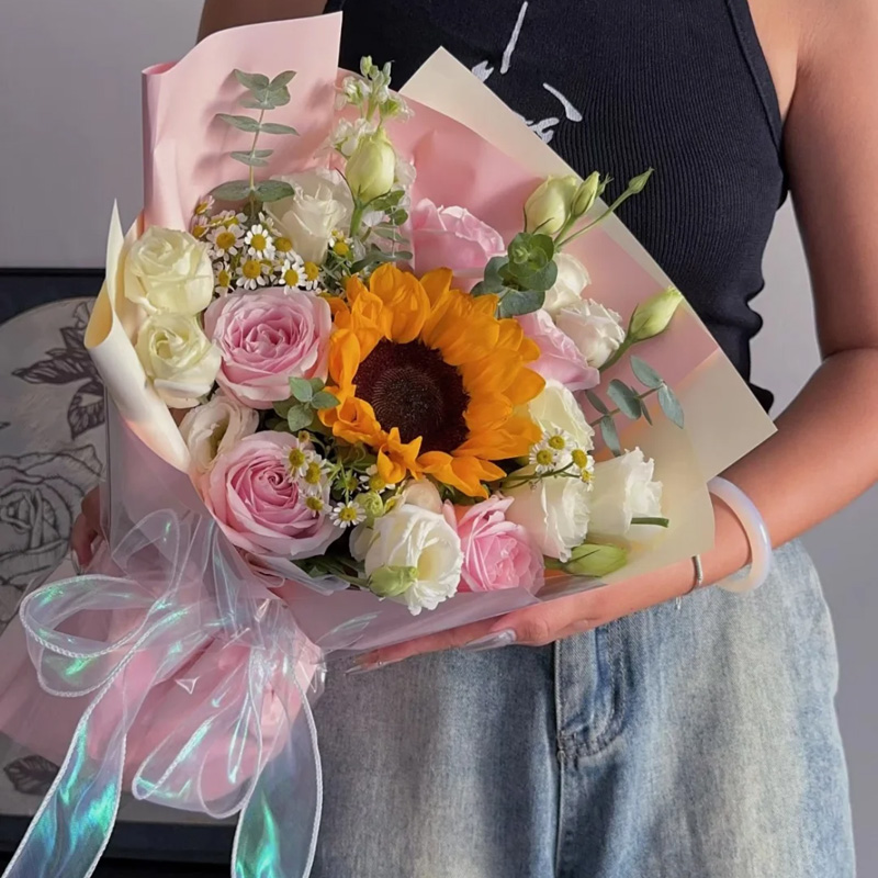 花 材:5朵粉红雪山玫瑰,1朵向日葵,搭配洋甘菊,多头洋桔梗,尤加利叶装饰。
