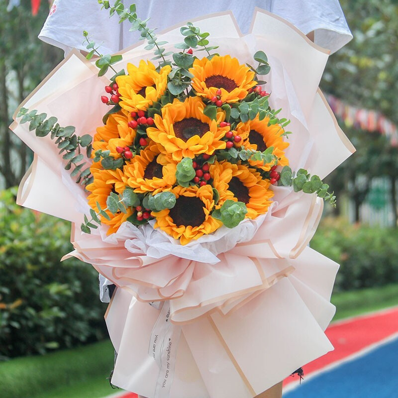 花材: 9枝向日葵,搭配红豆、尤加利叶装饰。
