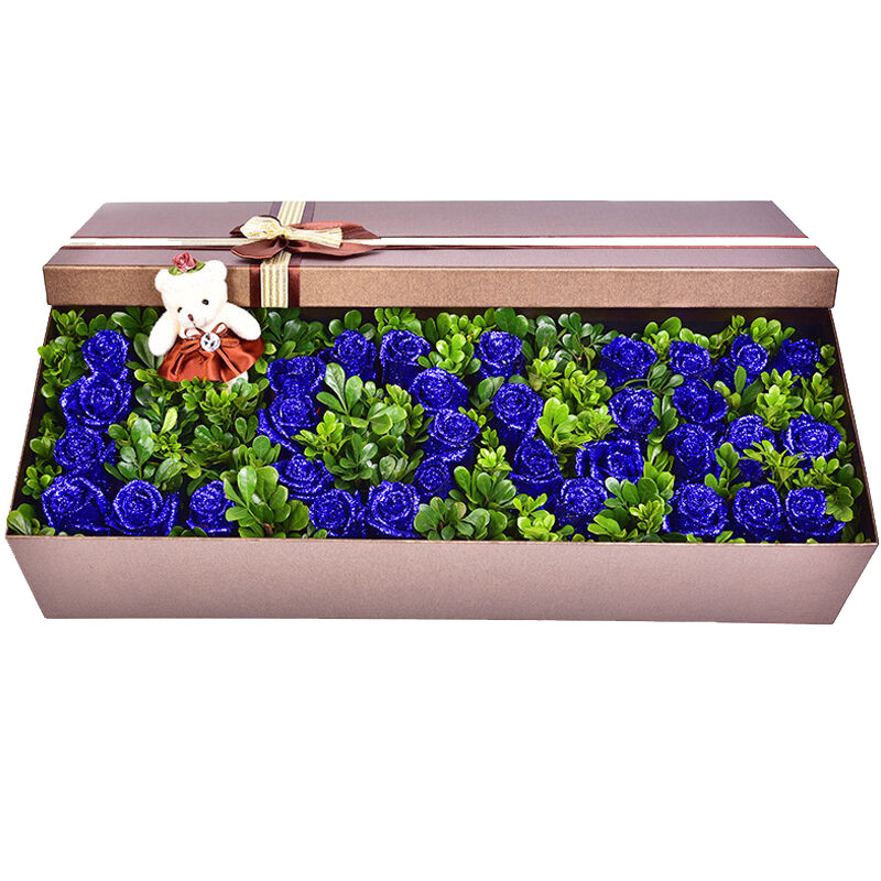 花材: 33支精品蓝色妖姬,“LOVE”形状,搭配丰满绿叶,1只可爱小熊。