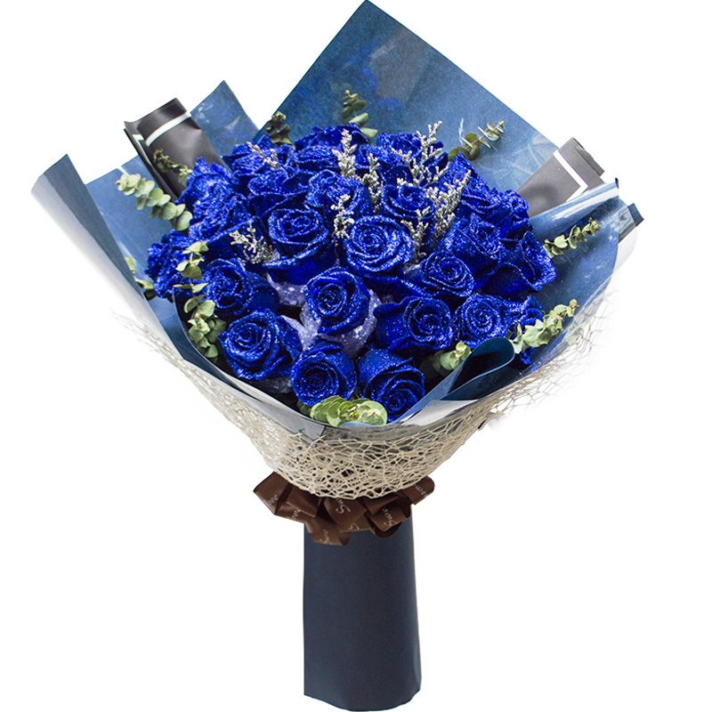 花 材:33支精品蓝色妖姬,搭配适量尤加利、情人草。