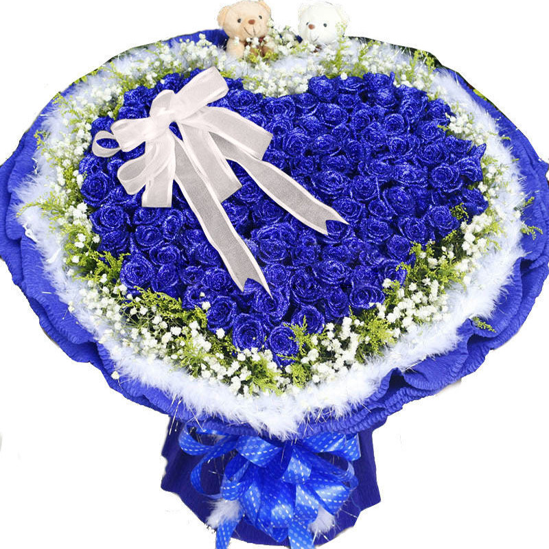 花 材:99支精品蓝色妖姬+2只可爱小熊,爱心形状,外围搭配适量黄莺、白色满天星、白色鹅毛。