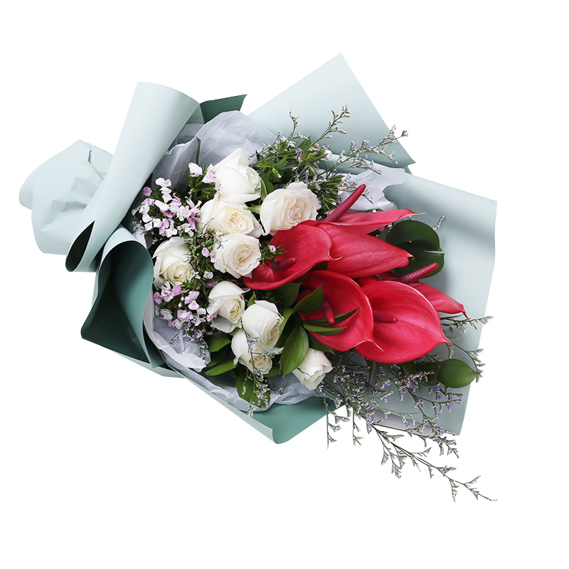 花材: 9朵白玫瑰,5枝红掌,搭配相思梅、水晶草、栀子叶。