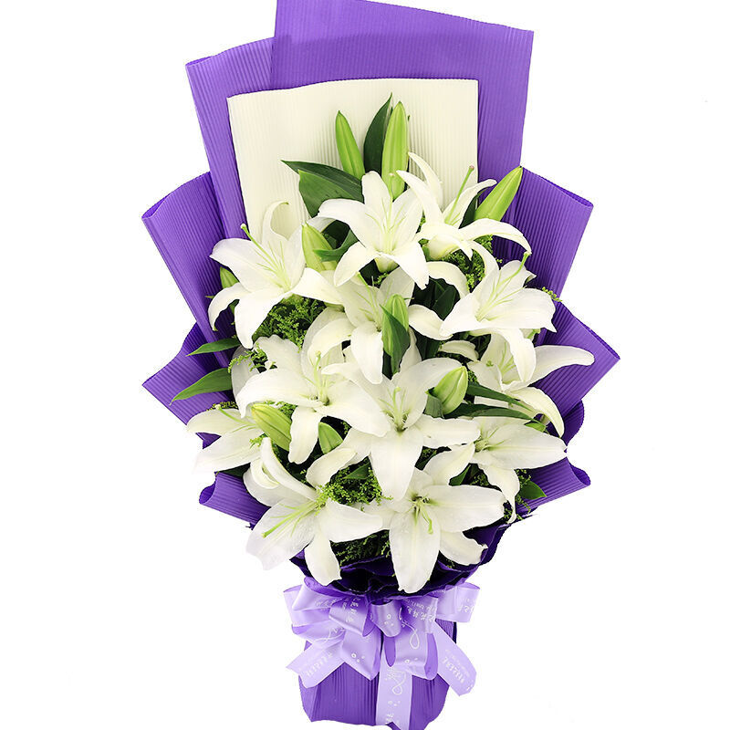 花材: 精选16朵香水白百合,新鲜黄莺点缀。