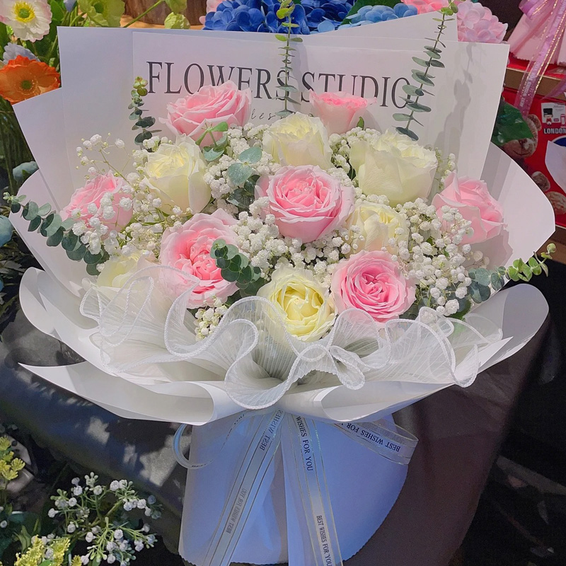 花材: 13朵玫瑰混搭(白玫瑰6朵、粉玫瑰7朵),搭配满天星、尤加利叶间插配饰。
