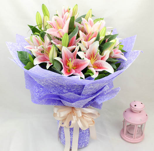 花 材:8枝粉色多头西伯香水百合,搭配绿色新鲜叶材。
