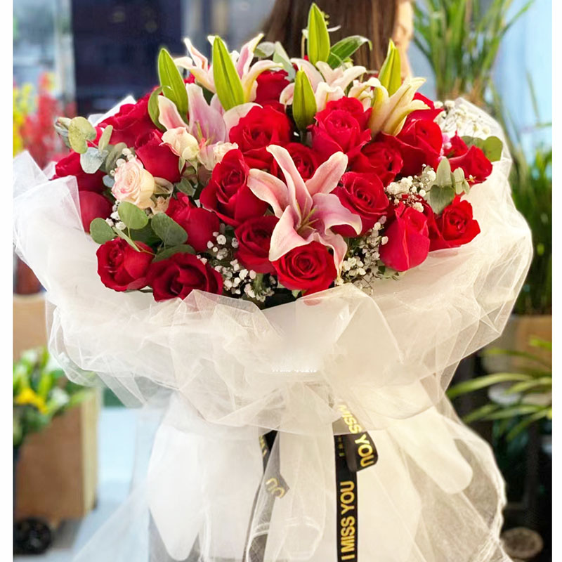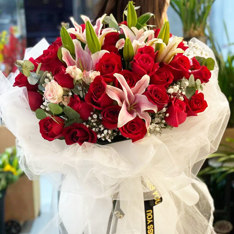 花材: 33朵红玫瑰,4支多头粉色香水百合,搭配尤加利叶、满天星装饰。
