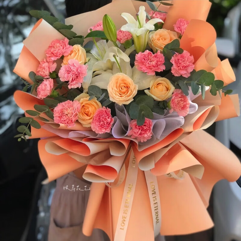 花 材:19朵粉色康乃馨、香槟玫瑰混搭,2支多头白百合,尤加利叶装饰。