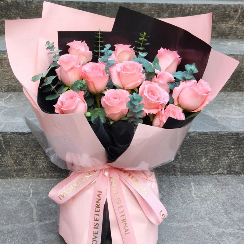 花 材:12朵粉玫瑰,搭配尤加利叶装饰。