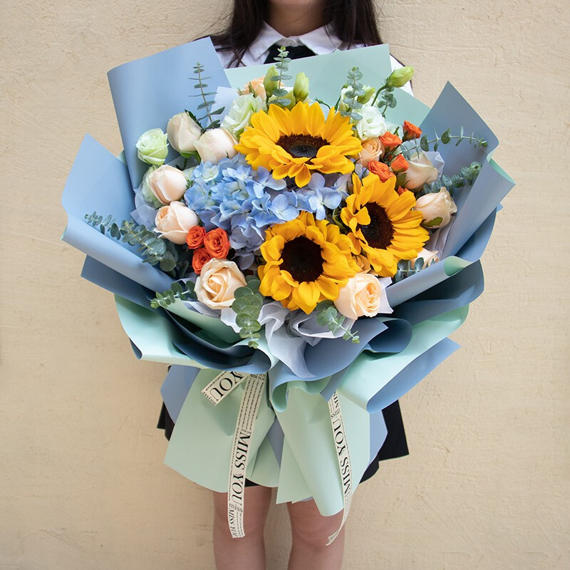 花 材:精选3支向日葵,1支蓝色绣球,11朵香槟玫瑰,搭配2支多头橙色小玫瑰,尤加利叶,桔梗装饰。
