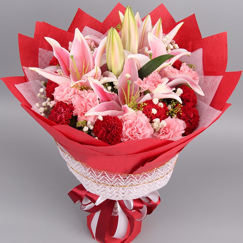 花材: 19支红粉混色康乃馨+2支多头粉百合,搭配适量满天星、黄莺。