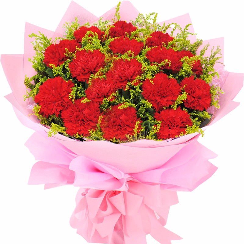 花材: 19支红色康乃馨,搭配适量黄莺。