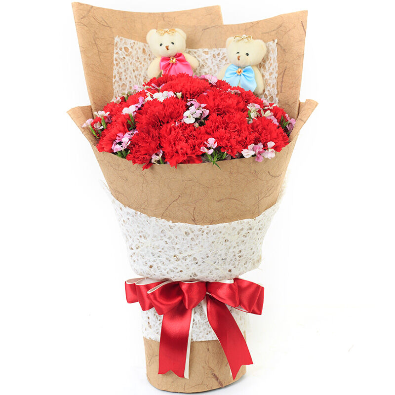 花材: 19支红色康乃馨,间插石竹梅,搭配2只可爱小熊。