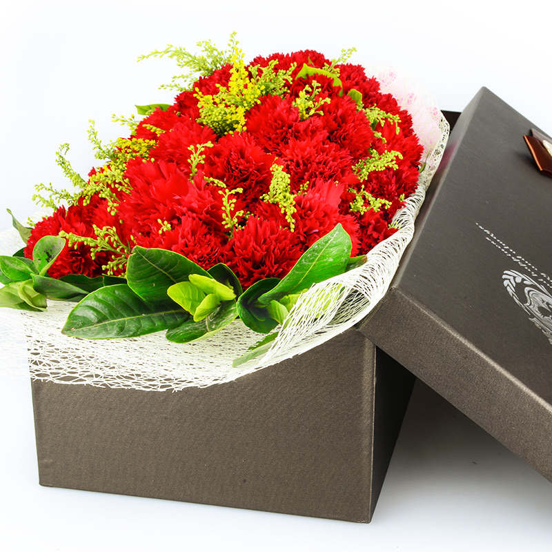 花材: 19支红色康乃馨,搭配适量黄莺、绿叶。