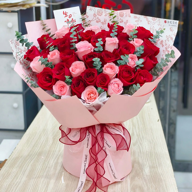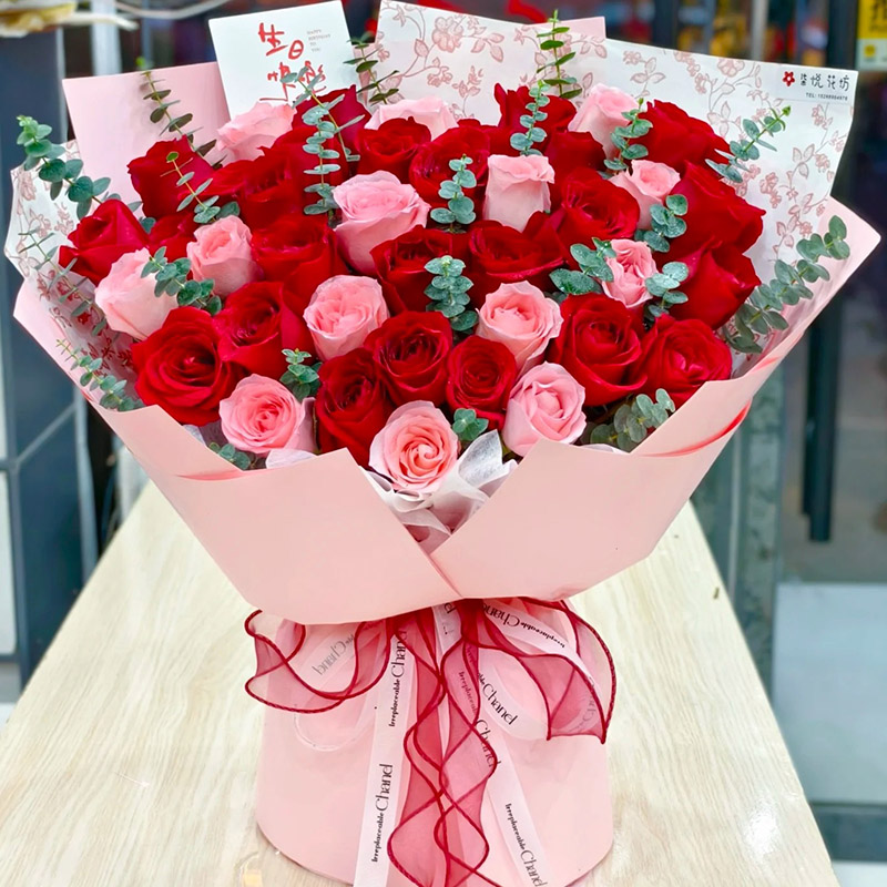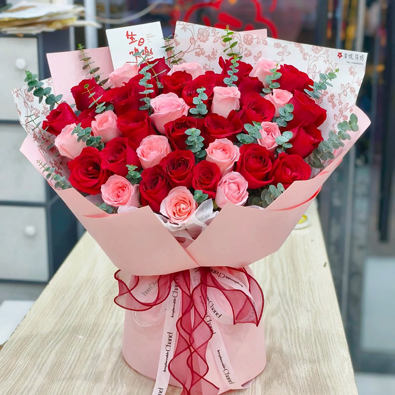 花材: 36朵红玫瑰、粉玫瑰混搭,尤加利叶装饰。