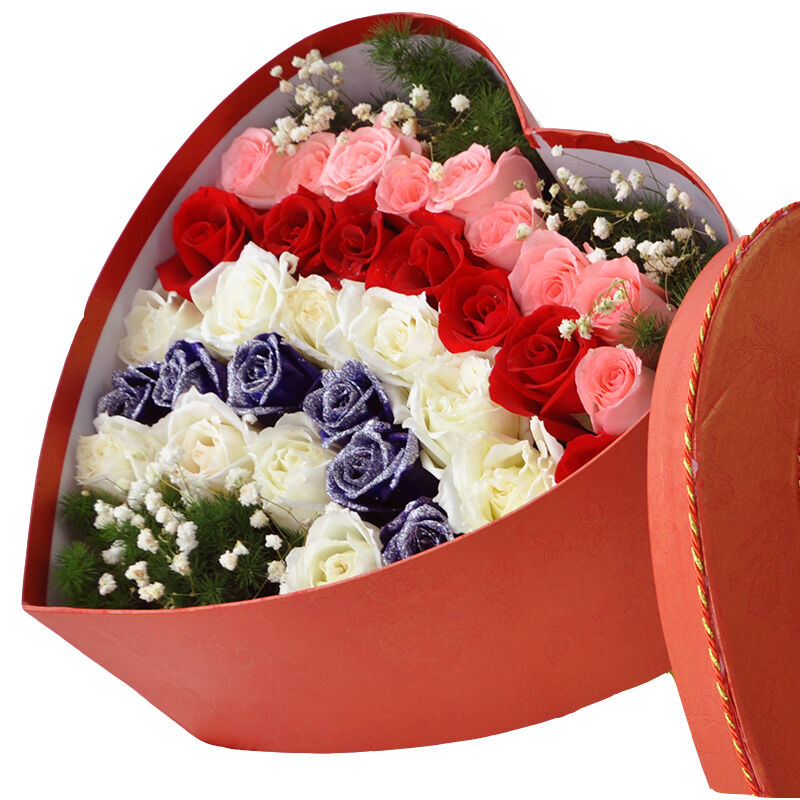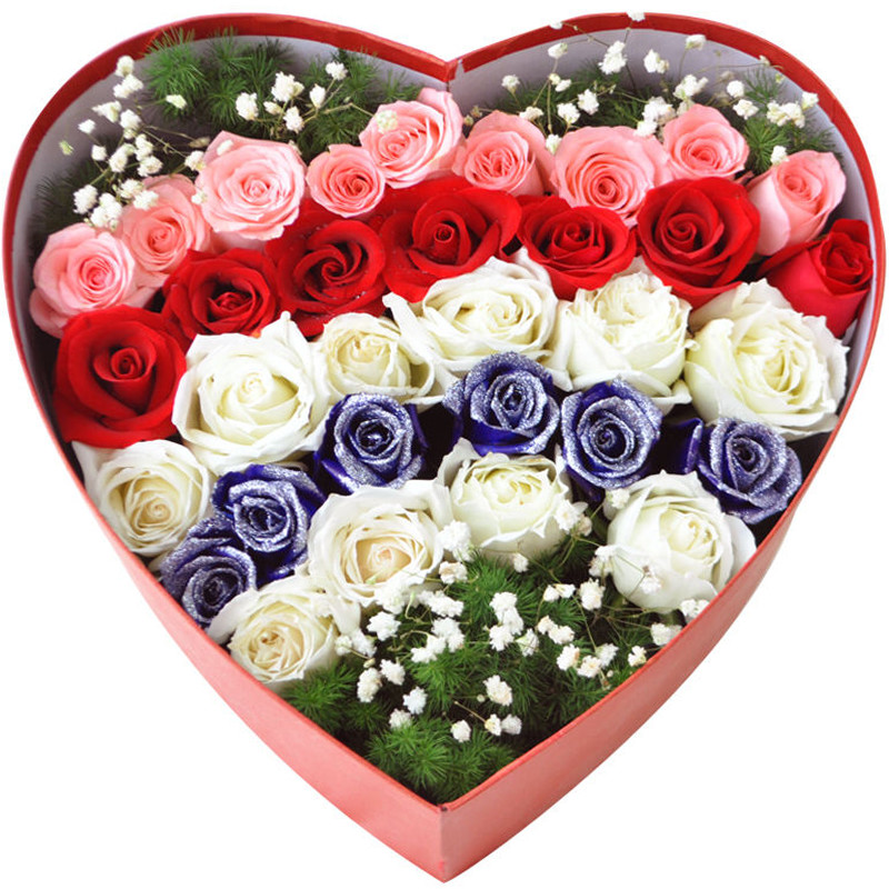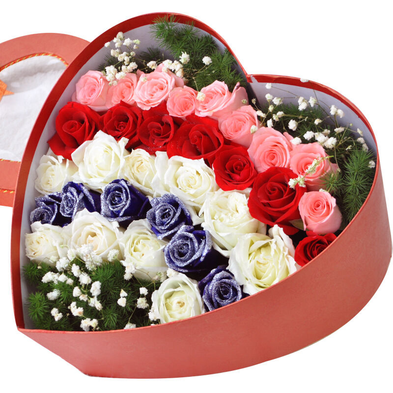 花 材:32支精品混色玫瑰(9支粉玫瑰+7支红玫瑰+10支白玫瑰+6支蓝玫瑰),搭配适量白色满天星、天冬门。