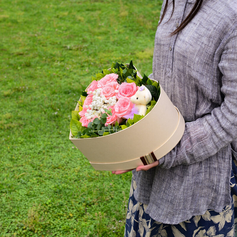 花材: 10支精品粉玫瑰+2只可爱小熊,搭配适量白色满天星、尤加利、栀子叶。