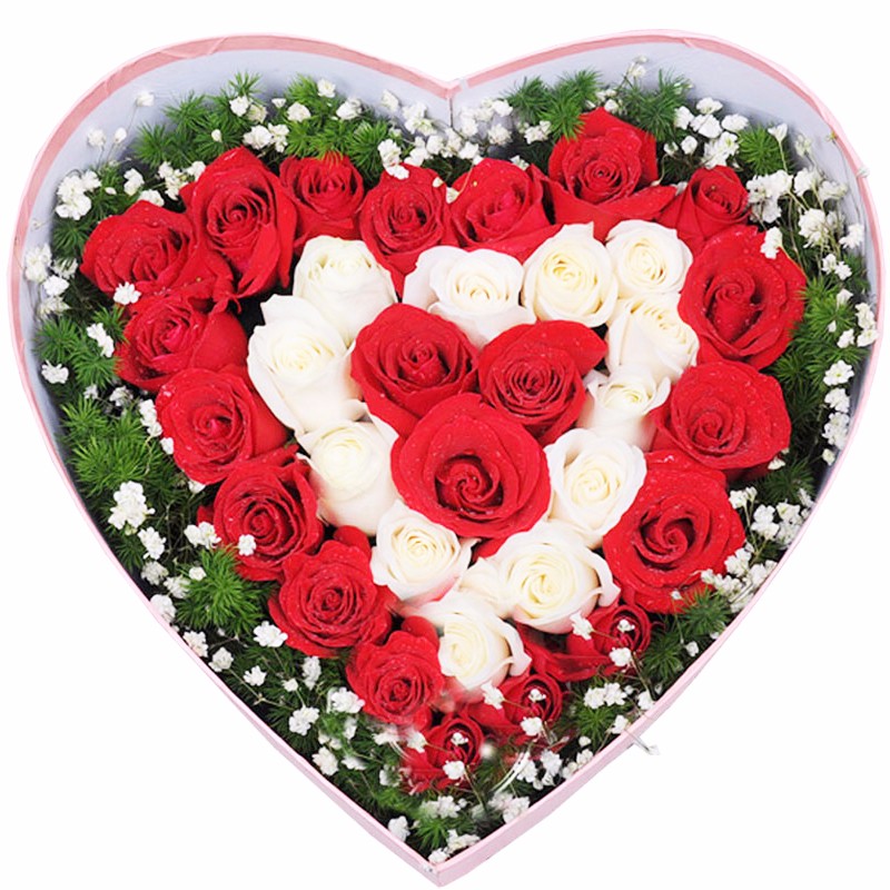 花 材:33支精品混色玫瑰(红玫瑰、白玫瑰),搭配适量白色满天星、天冬门。
