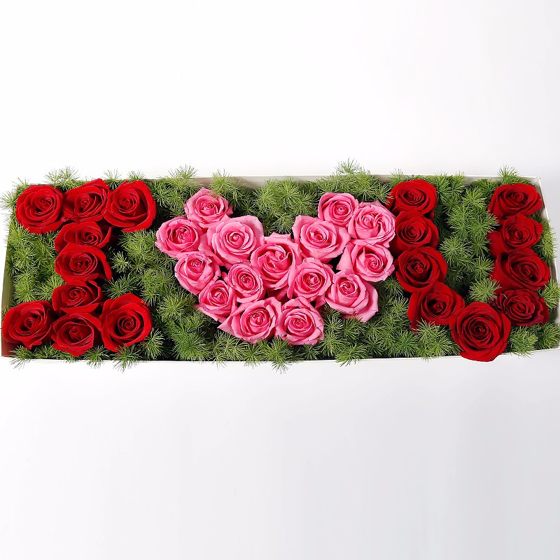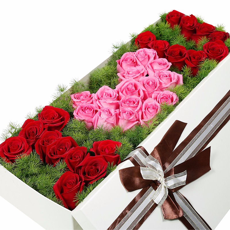 花材: 33支精品混色玫瑰(红玫瑰、粉玫瑰),搭配适量天冬门。