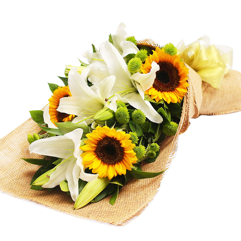 花材: 3朵向日葵,3枝多头白色香水百合,搭配小雏菊、栀子叶。