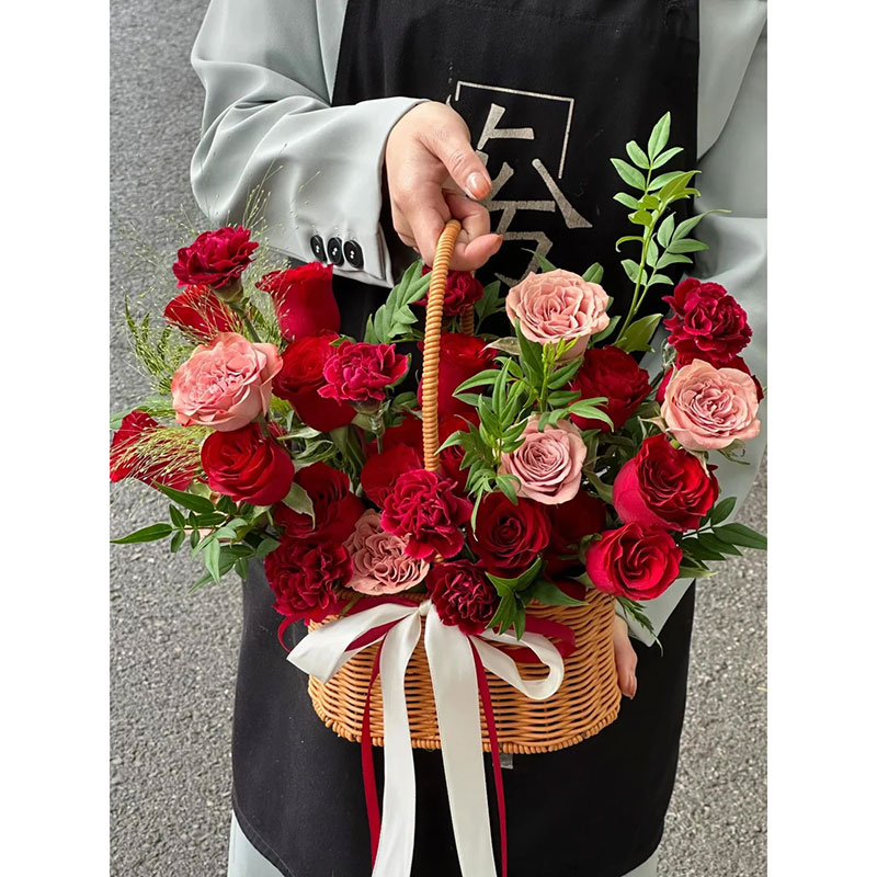 包 装:精美手提花篮,提手处用红色、香槟色丝带系蝴蝶结装饰。(篮子和配饰等具体以当地实物为准)