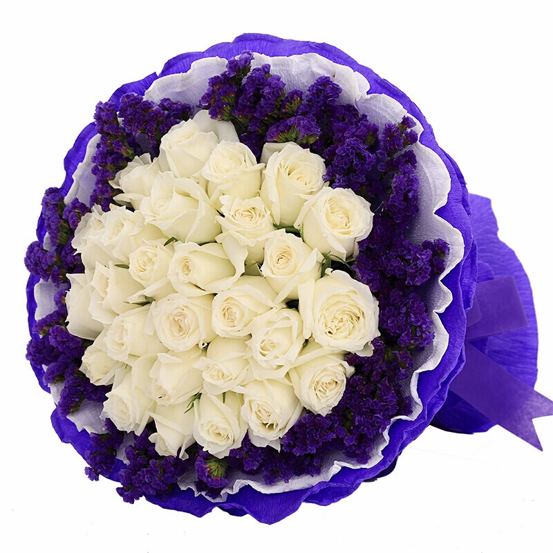 花材: 33朵精品白玫瑰,外围勿忘我丰满点缀。