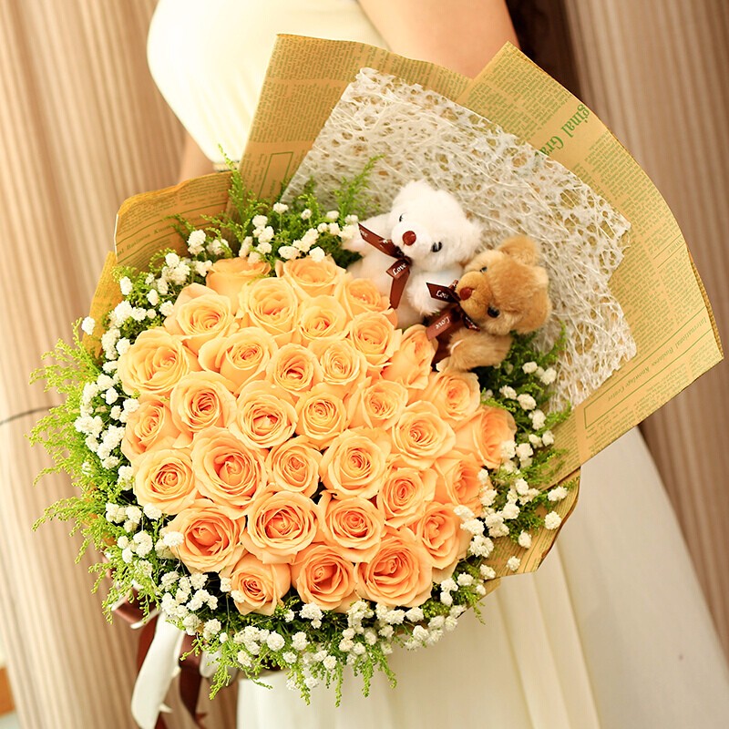 花 材:精选33朵香槟玫瑰,2只可爱公仔,外围满天星、黄莺配花点缀。