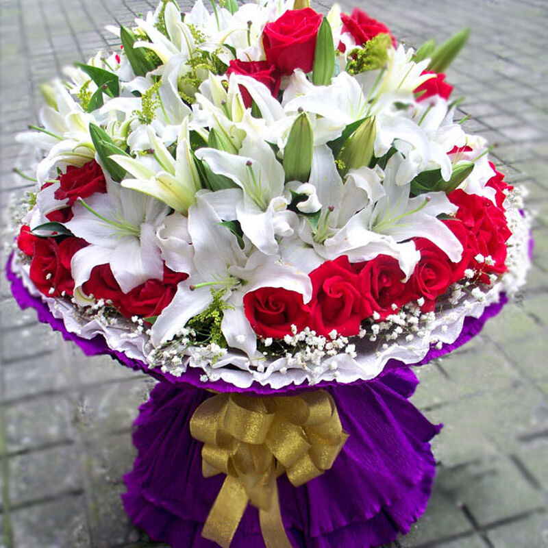 花材: 精选52朵红玫瑰,52朵白色香水百合,满天星环绕。