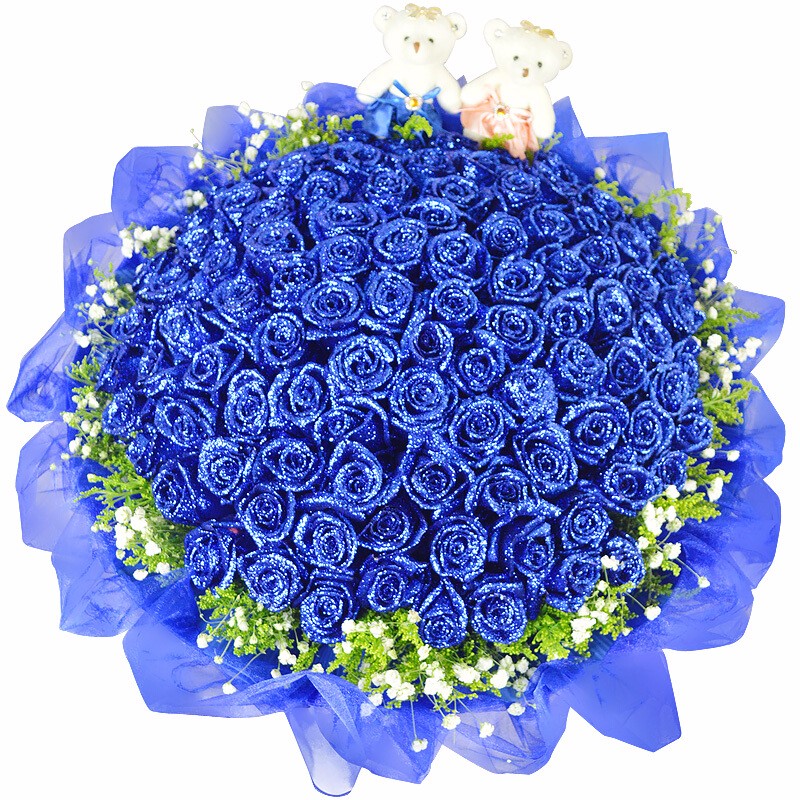 花材: 66朵顶级蓝玫瑰,2只可爱小熊,满天星、黄莺环绕。