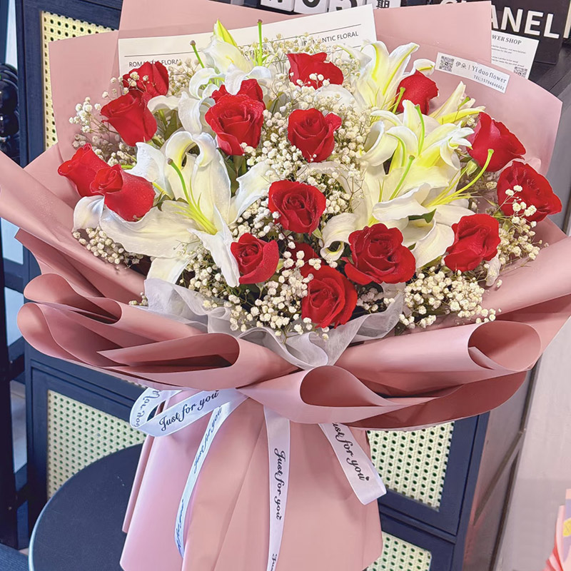 花材: 19朵精品红玫瑰,4支多头白色香水百合,搭配满天星装饰。