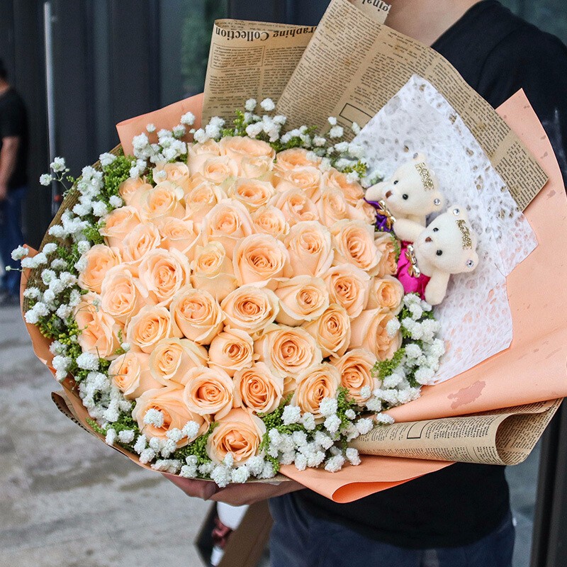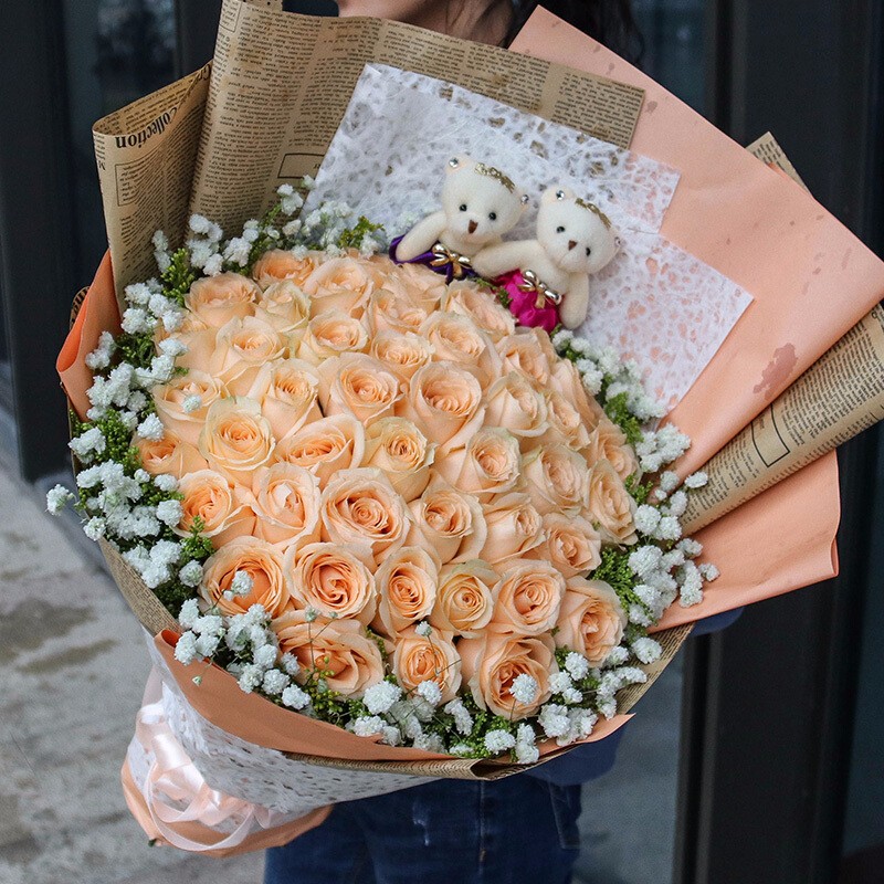花材: 52支香槟玫瑰,2只可爱公仔,黄莺、满天星装饰。
