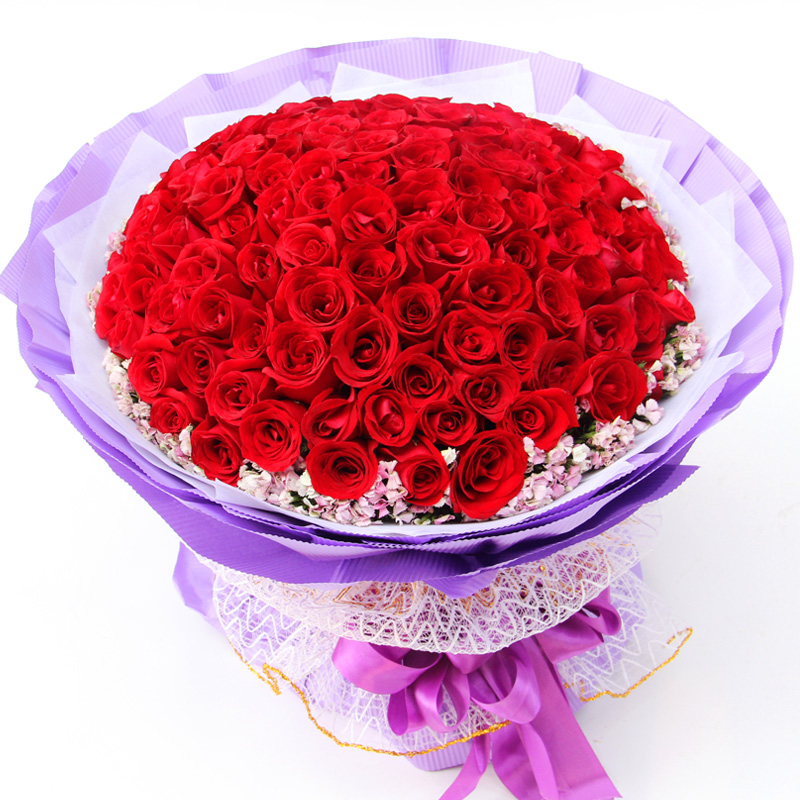 花材: 66支精品红玫瑰,搭配粉色石竹梅外围环绕。