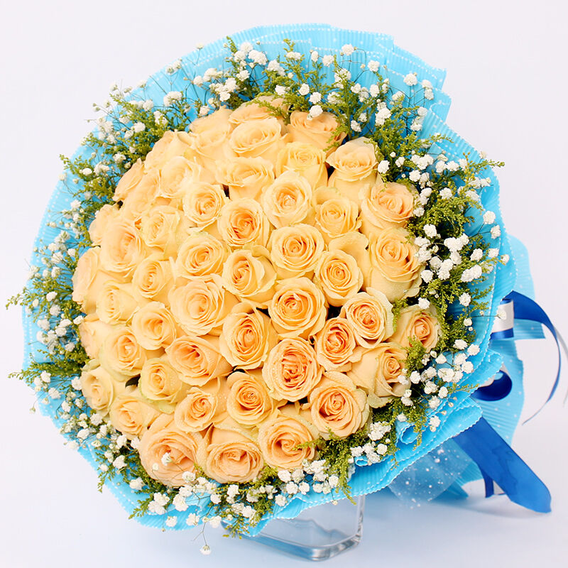 花 材:66支顶级香槟玫瑰,黄莺、满天星围绕。