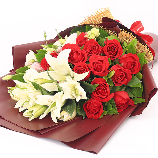 花材: 12朵红玫瑰,3枝多头香水白百合,3枝粉色桔梗,栀子叶。