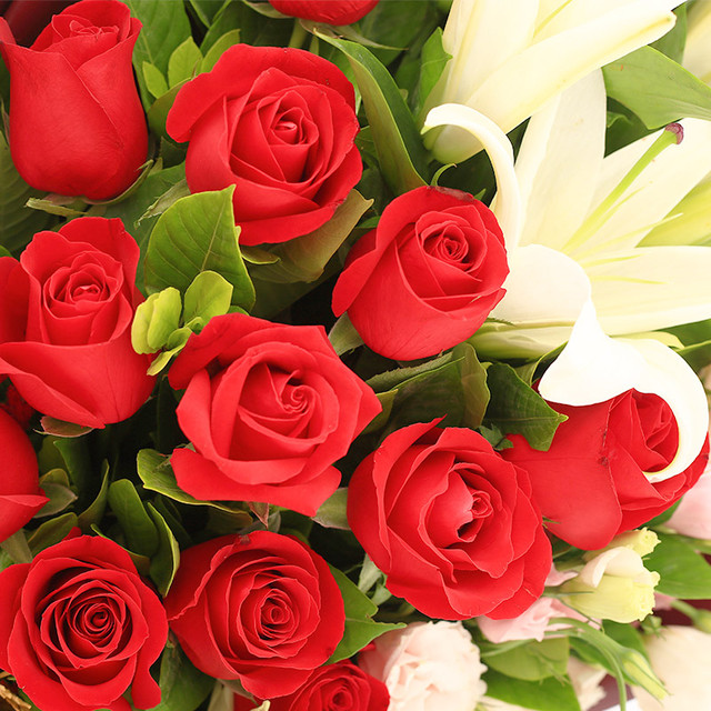 花 材:12朵红玫瑰,3枝多头香水白百合,3枝粉色桔梗,栀子叶。