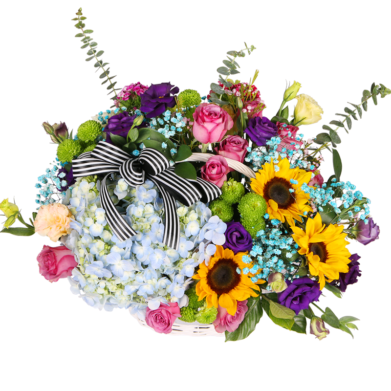 花 材:9支精品紫玫瑰、1支蓝色绣球、3支向日葵、4支多头紫色洋桔梗、2支香槟色洋桔梗,搭配蓝色满天星、绿色小雏菊、尤加利叶,一朵蝴蝶结装饰花面。