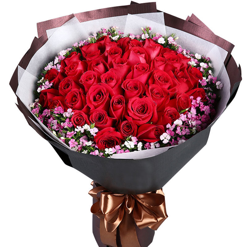 花材: 33朵红玫瑰,搭配石竹梅外围点缀。