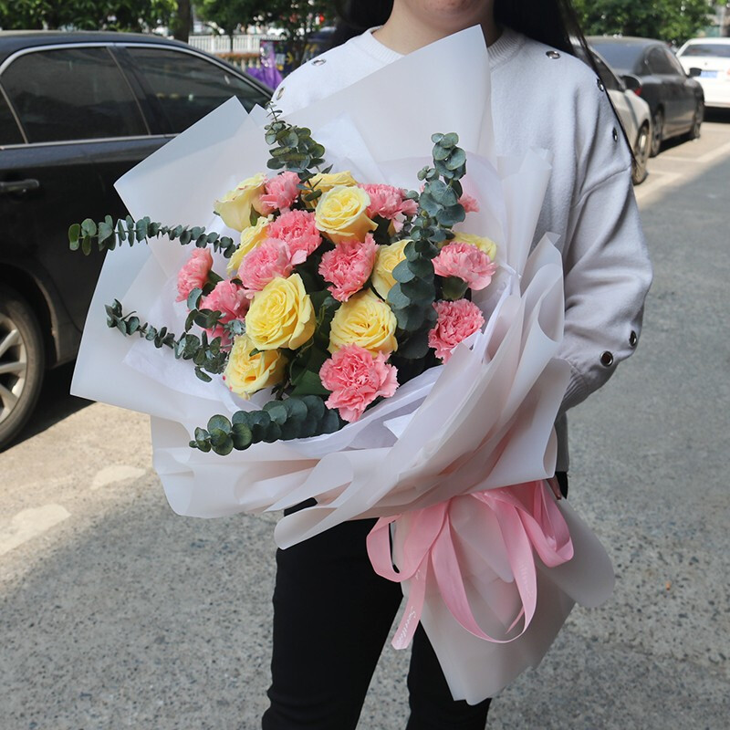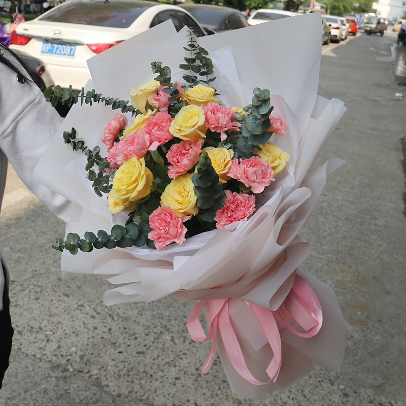 花 材:11朵粉色康乃馨,10朵香槟色玫瑰,搭配尤加利叶。