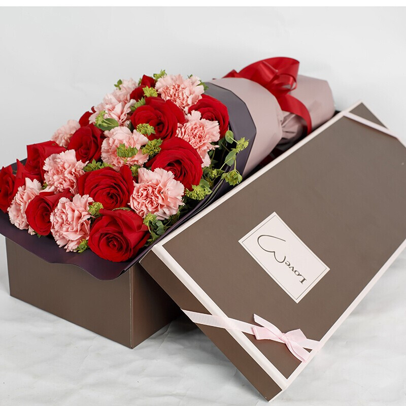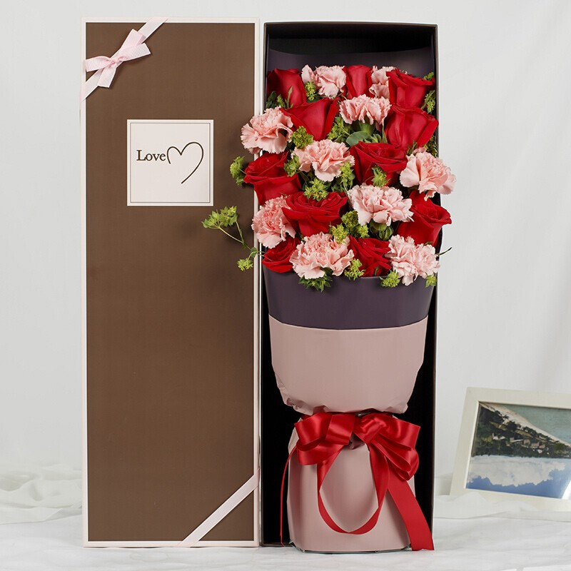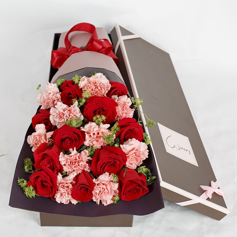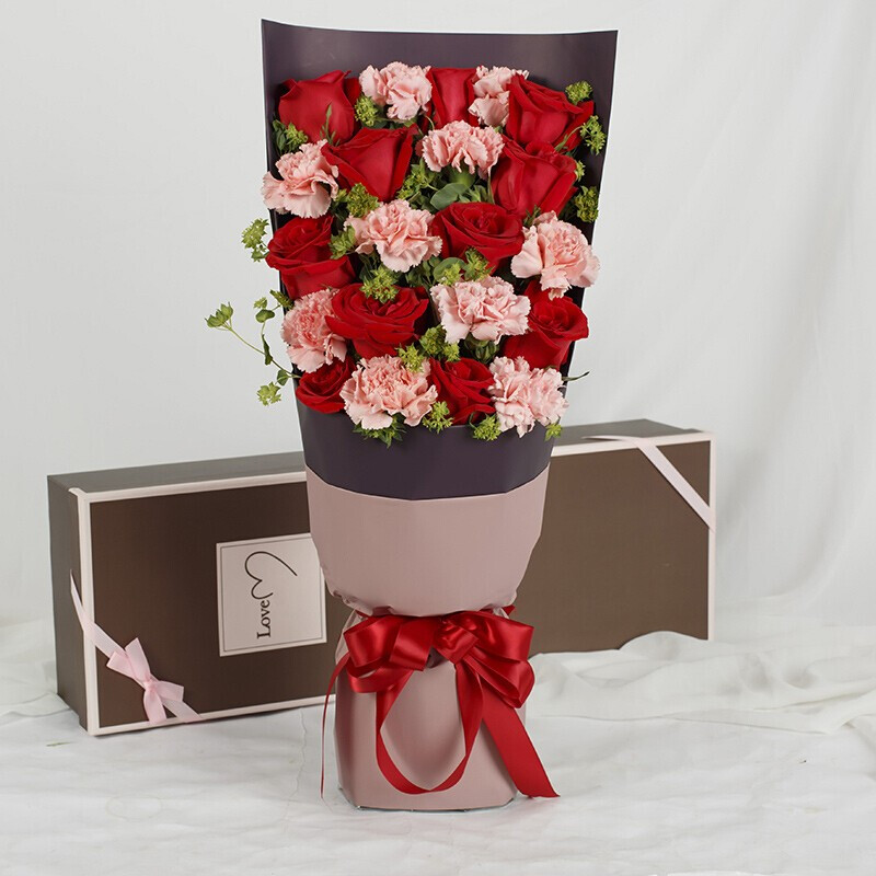 花 材:精选11朵红玫瑰,10朵粉色康乃馨,搭配叶上黄金点缀。