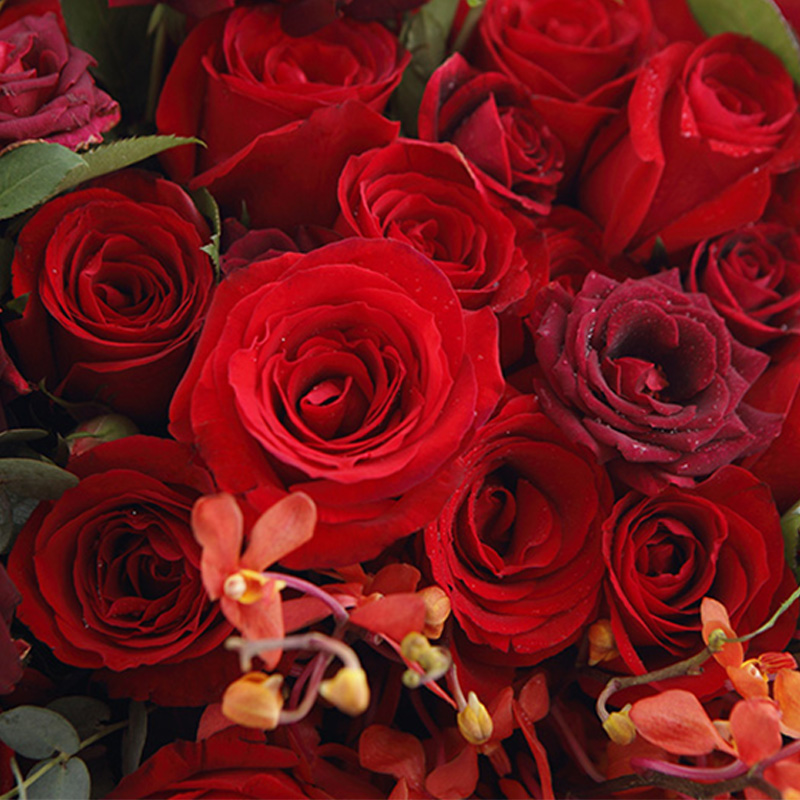 花 材:卡罗拉红玫瑰33支、大红色多头玫瑰10支,搭配适量红色千代兰、红色朱蕉叶、尤加利叶装饰。(请至少提前1天订购,或订购前咨询客服)