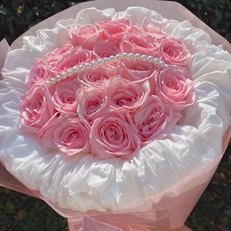 花材: 19朵粉荔枝玫瑰,珠串装饰花面。