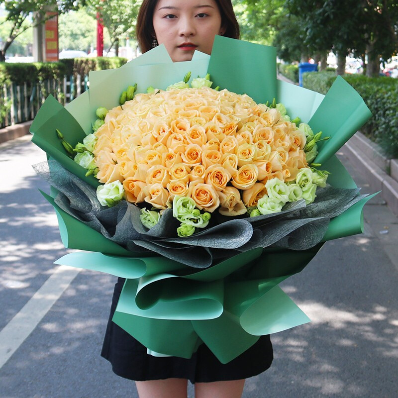花 材:99朵精品香槟玫瑰,外围桔梗花环绕。