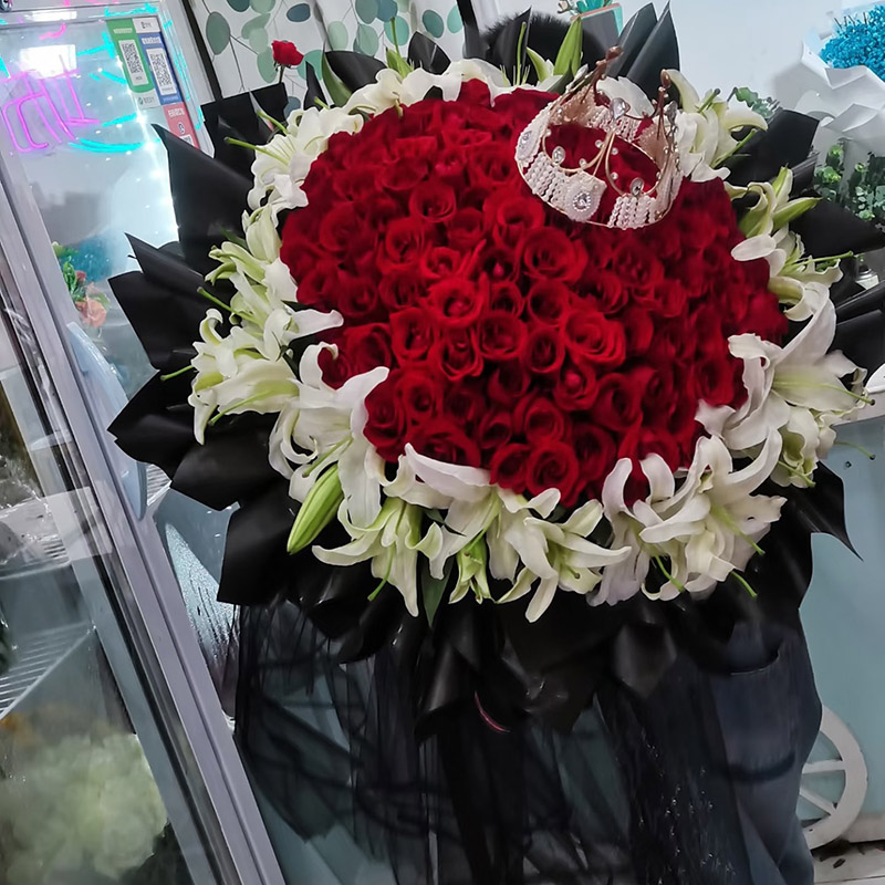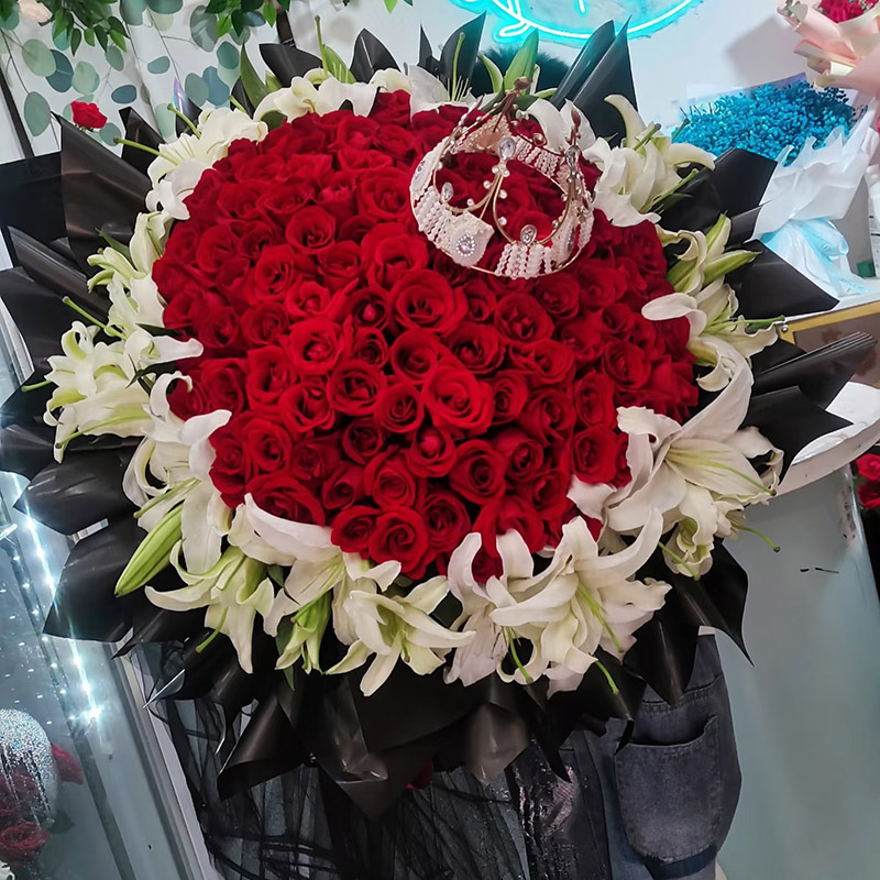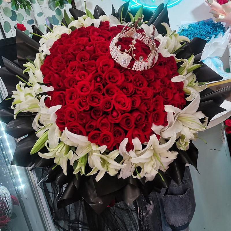 花材: 99朵顶级红玫瑰,33朵白色香水百合外围环绕,皇冠装饰花面。