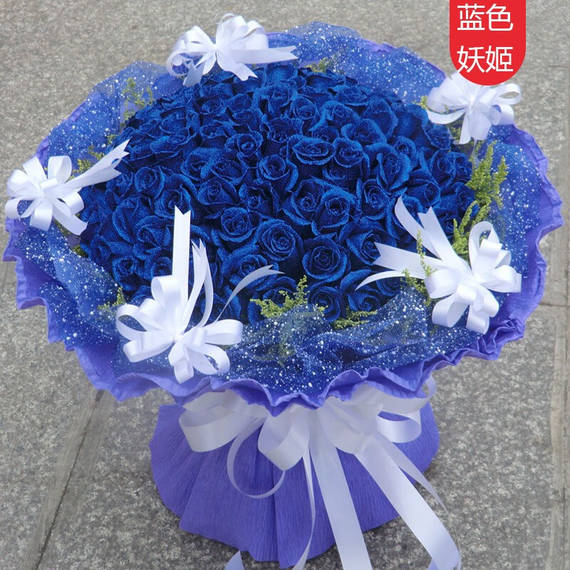 花 材:99朵蓝色妖姬,搭配少量黄莺草外围装饰。