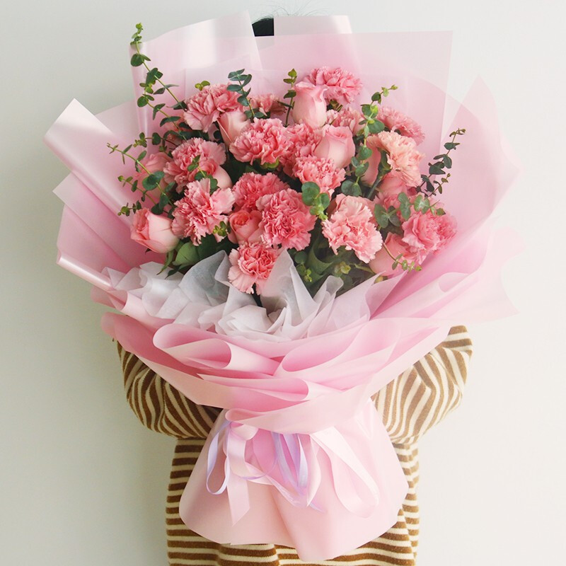 花材: 33朵粉色康乃馨、粉玫瑰混搭,搭配尤加利叶、栀子叶装饰。