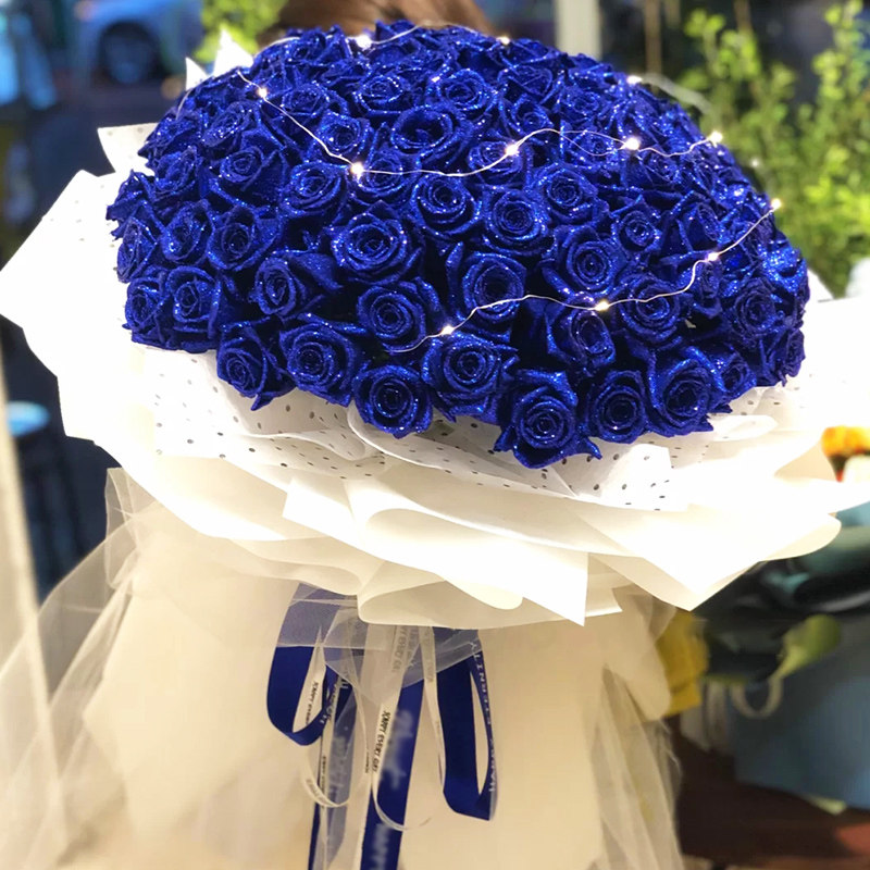 花 材:99朵精品蓝色妖姬,搭配灯带装饰。