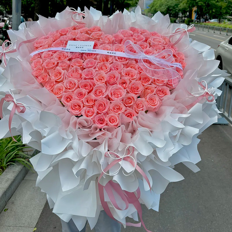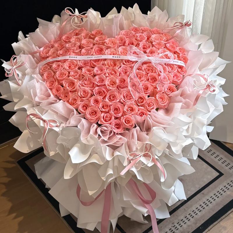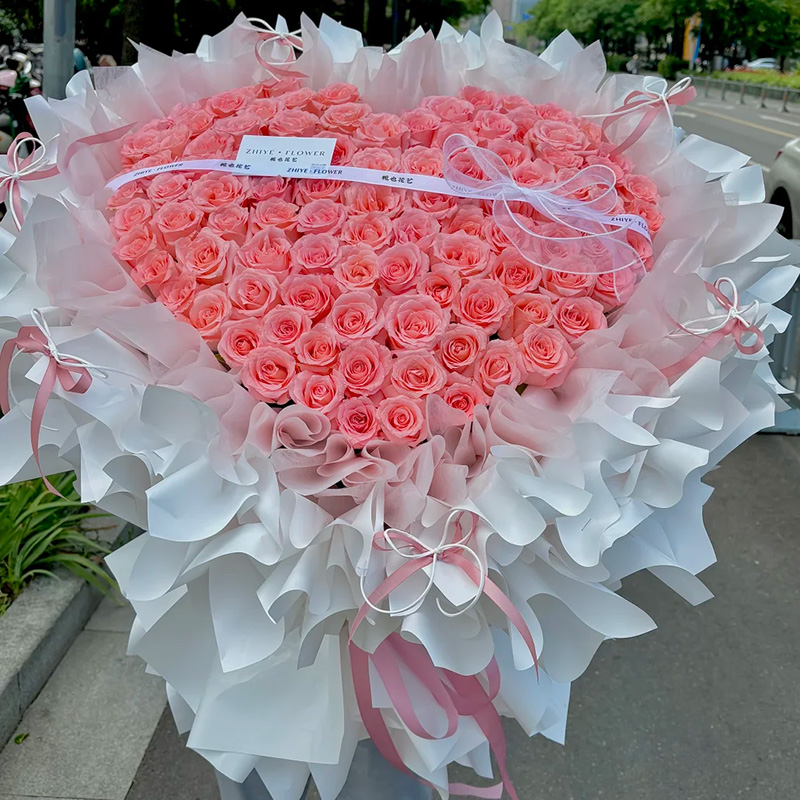 花材: 99朵戴安娜粉玫瑰,心形造型,搭配1条白色英文缎带装饰花面。